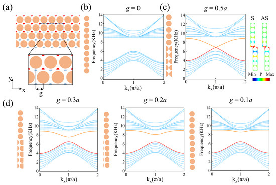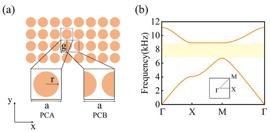 Our study starts with a square lattice composed of epoxy cylindrical scatterers placed in an air background. Figure 1a shows the proposed PC, and the radius of each scatterer is r (=0.416a), where a (=2.5 cm) represents the lattice constant. We take the unit cell containing a cylindrical scatterer as the original unit, defined as PCA, as shown in the lower-left part of Figure 1a. Another choice of unit cell for PC is also shown in the lower-right part of Figure 1a, where two half-cylindrical scatterers are evenly distributed on the left and right sides of the unit cell, defined as PCB. All numerical simulations in this study were conducted using COMSOL Multiphysics 6.1 based on the finite element method. Figure 1b presents the phonon band structure of PCA(PCB), where a complete band gap is observed between the first and second bands, indicated by a yellow region. The complete band gap between 6556 Hz and 9045 Hz arises from Bragg scattering within the periodic structure [33]. When sound waves propagate through a medium with a periodic structure, a periodic arrangement of scatterers induces strong multiple scattering. The interference between these scattered waves leads to destructive interference within specific frequency ranges, blocking the propagation of sound waves and forming band gaps. Here, we define g as the gliding parameter along the x-direction, as shown in Figure 1a. Glide reflection (GR) refers to a symmetry operation in which a crystal reflects within a plane and then moves a certain distance along that plane. This translation distance is the gliding parameter, which specifically determines the displacement of the crystal in the x-direction. Therefore, PCA (PCB) can be achieved by gliding PCB (PCA) by g (=). PCA and PCB possess different topological properties, due to glide-reflection (GR) symmetric dislocations.