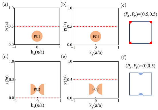 PCA has C4 symmetry, whereas PCB has C2 symmetry. According to the International Tables for Crystallography, the Wyckoff positions [34] for crystals with twofold rotation symmetry are located at the center, corners, and midpoints of edges. Using the Wilson-loop method, we are able to calculate the Berry phase to determine the bulk polarization parameter and identify the position of the Wannier center. Figure 2 illustrates the Berry phase for the first band along the closed loop () for a fixed (). For PCA, as depicted in Figure 2a,b, the Berry phase along both and is 0.5, indicating nontrivial bulk polarization . Consequently, the Wannier center of the first band is located at the four corners of the unit cell, as shown in Figure 2c. Similarly, for PCB, as shown in Figure 2d,e, the Berry phase along is 0, and along is 0.5, indicating nontrivial bulk polarization . The Wannier center is located at the midpoints of the top and bottom edges, as illustrated in Figure 2f. Hence, we can obtain two different Wannier configurations: one is the PCA, whose symmetric Wannier functions are centered at the corners (denoted by red); and the other is the PCB, whose symmetric Wannier functions are centered at the midpoints of edges (denoted by blue). The discrepancy in the Wannier centers between PCA and PCB leads to the emergence of edge states along the interface between PCA and PCB.