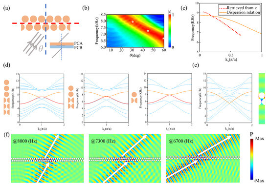 Then, we utilize the upper branch of the edge state with to achieve negative refraction. As illustrated in Figure 3c, the edge state of the upper branch exhibits negative dispersion in a broad range of , indicating that negative refraction can be achieved over a wide range of incident angles. The proposed phononic crystal interface with GR symmetry can be used to manipulate sound waves propagating in the direction opposite to conventional refraction, thereby enabling novel wave manipulation. To validate this idea, we conducted simulations for the transmission of sound waves when a plane wave is incident on a single-domain wall structure with , as illustrated in Figure 4a, where the gray line represents the incident plane wave at an angle of . Here, there is only one layer of PCA (PCB), which makes it easy to couple the incident plane wave into the edge state. The blue dashed line represents the normal of the interface, while the red dashed line represents the boundary between PCA and PCB. We selected the frequency (ranging from 6 kHz to 8.5 kHz) and incident angle (ranging from to ) of the incident sound wave as parameters to evaluate the transmission coefficient , as shown in Figure 4b. It is observable that over a broad range of incident angles, there is a specific frequency range that yields a high transmission coefficient, which originates from the excitation of the edge states. Moreover, owing to the conservation of momentum (wave vector) along the interface direction, we can deduce the dispersion relationship from the transmission spectrum and compare it with the dispersion in Figure 3c. In Figure 4c, the dispersion relationship retrieved from the transmission spectrum is plotted with red dots, and the dispersion in Figure 3c is plotted with an orange solid line. The similarity between the two dispersion relationships indicates that our designed structure can achieve effective coupling between the incident sound wave and the edge states. The observed discrepancy between the two dispersion relationships can be attributed to the influence of the air layer. In the previous simulation of band projection, we added a sufficient number of PCs (N = 10) on both sides of the structure to prevent interference from the air layer, providing a complete boundary band dispersion distribution without band interference, thereby facilitating the analysis of subsequent phenomena. However, in the subsequent simulation of negative dispersion, to meet the needs of practical negative refraction structure design and increase the transmittance of incident waves, it is necessary to minimize the absorption of waves by the boundaries as much as possible, which requires reducing the number N of unit cells in the vertical direction. We plotted the band projection as the number of layers N of the supercell strip gradually decreased, as depicted in Figure 4d. It is evident that as the number of layers N decreases, the boundary states persist stably. Even when the strip comprises only one unit cell each of PCA and PCB (N = 2), the boundary states remain intact. So that, in the case of N = 2, it can be considered that an infinitely long air layer is located at the top and bottom of the system, and the ineffective band in the air layer will enter the band gap, resulting in a faster descent of the boundary band along the positive kx direction and a decrease in the frequency of degenerate Dirac points. The new boundary band generated in this way is quite consistent with the dispersion retrieved from the transmission spectra, as shown in Figure 4e.
