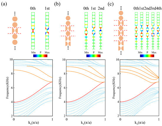 Further, we consider the multiple-domain walls based on GR symmetric phononic crystals, where the couplings between edge states and negative refraction occurs. The projected phonon bands for two-domain wall, three-domain wall, and five-domain wall structures were calculated, as shown in Figure 5. The upper-left parts of Figure 5a–c show the supercells with two-domain walls, three-domain walls, and five-domain walls, corresponding to PCA/PCB/PCA, PCA/PCB/PCA/PCB, and PCA/PCB/PCA/PCB/PCA/PCB structures. Here, the gliding parameter g for the adjacent PCs is , and the red dashed lines indicate the interfaces between PCA and PCB. For multiple-domain wall structures, when the adjacent interfaces are close to each other, due to the coupling between the edge phonon states, coupled edge states (CESs) can be observed. The lower parts of Figure 5a–c show the projected phonon bands for two-domain walls, three-domain walls, and five-domain walls. Two, three, and five upper branches of the CESs are found, which are plotted with orange solid lines, corresponding to two-domain walls, three-domain walls, and five-domain walls, respectively. In a similar way, the lower branches of the CESs are also achieved, but one, two, and four lower branches of the CESs are involved in the bulk bands. Thus, only one lower branch of the CES is found in the band gap, which is plotted with a red solid line. In addition, the blue dots represent the bulk bands. For the two-domain wall, three-domain wall, and five-domain wall, the upper branches of the CESs exhibit negative slopes in a wide range, thus enabling the realization of negative refraction within a multiple-domain structure. It is observed that a common frequency range can be found where the upper branches of CESs are simultaneously in their negative dispersion regions. Furthermore, we calculated the modal distributions of CESs with negative dispersion when . In the upper-right parts of Figure 5a–c, the modal distributions are shown for the 0th and 1st; 0th, 1st, and 2nd; and 0th, 1st, 2nd, 3rd, and 4th modes, from low frequency to high frequency, respectively. The upper branches of CESs possess the negative slope, which provides a possible way of achieving negative refraction with controllable negative displacement.