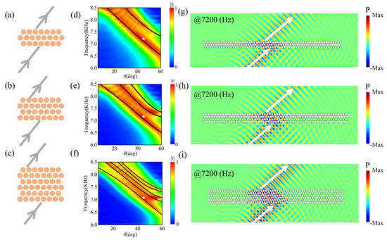 Figure 6g–i illustrate the pressure distributions of two-domain walls, three-domain walls, and five-domain walls, when the frequency of the incident sound wave is 7200 Hz under a incident angle, corresponding to the white star in Figure 6d–f. Notably, the outgoing sound waves exhibit a strong negative refraction effect, resulting in negative displacements of (=15 cm), (=22.5 cm), and (=32.5 cm), corresponding to the cases of two-domain walls, three-domain walls, and five-domain walls, respectively. Moreover, the increasing distance of the outgoing sound waves from the normal with additional layers of domain walls, along with the layered patterns of the internal field within the structures, indicates that each layer of domain walls guides the sound waves with negative displacement. These results confirm that using GR symmetric phononic crystals to construct multiple-domain structures effectively creates a coupled waveguide array, facilitating the realization of negative refraction with a wide range and multiple degrees of control. Compared with the results of the single-wall structure in Figure 4, the multiple-domain walls can achieve negative refraction with large negative displacement. This approach offers a versatile method for exploring topological heterostructures capable of realizing negative refraction.
