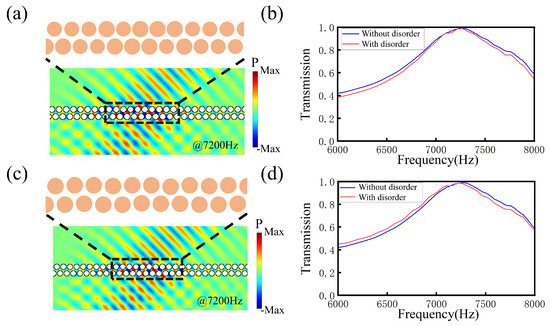 To confirm the high fabrication tolerance of our design, we introduce disorder to the radius and position of the scatterers. Here, we take the single-domain wall structure in Figure 4 with an incident angle of , for example, and restrict the perturbations of the radius and position below the levels of 4% and 2%, respectively. As shown in Figure 7a, the region with radius disorder is indicated by the black dashed rectangle. Then, we calculate the transmission of the single-domain wall. As shown in Figure 7b, there is no difference for the structures with and without radius disorder, which shows that our structure is robust. Similarly, Figure 7c presents a schematic of the single-domain wall structure with position disorder. As shown in Figure 7d, there is no difference for the structures with and without position disorder, which also shows that our structure is robust.