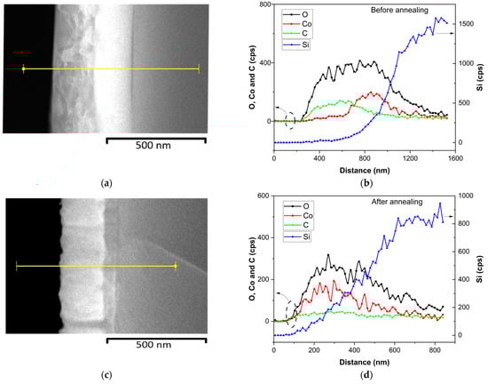 Figure 1 presents the surface morphology and SEM cross-sectional images of the as-deposited LiCoO2 coating. The surface morphology revealed the formation of islands on the coating’s surface, while the cross-sectional SEM image exhibited the following two layers: a top layer likely corresponding with the surface islands and a bottom layer with a columnar structure. Additionally, the EDS analysis showed a higher oxygen content (55%) compared with cobalt (12%). The SEM cross-sectional image also highlighted the presence of an additional thin top layer, likely formed due to exposure to air. To further investigate the chemical composition of this top layer, an EDS line profile of the LiCoO2 coating was produced, both before and after annealing at 600 °C (Figure 2). Notably, in the top layer before annealing, cobalt (Co) was nearly absent, while oxygen (O) and carbon (C) were present in significant amounts, as shown in Figure 2b. This top layer was likely composed of Li2CO3 [20], which may have formed during exposure to air containing trace amounts of CO2. After annealing, this top layer disappeared (Figure 2c), revealing a single crystallized layer consisting of Co, O, and likely Li elements, as illustrated in Figure 2d.