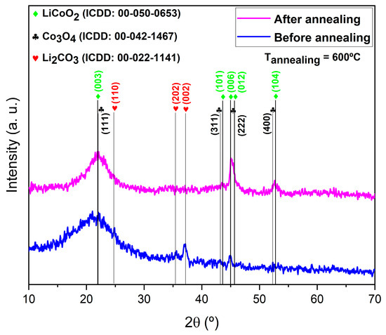 Initially, the sample required annealing to achieve optimal crystallinity, as it was somewhat amorphous in its as-deposited state. To address this, the sample was annealed from room temperature (approximately 25 °C) to 600 °C. Figure 3 shows the XRD patterns of the LiCoO2 coating before and after annealing. Annealing was conducted in an Ar gas atmosphere, with a temperature ramp rate of 5 °C/min. The increase in annealing temperature improved the structural properties, as evidenced by the narrowing of the diffraction peaks. Additionally, the diffraction peaks associated with the Li2CO3 phase, particularly the (002) plane at 37.09°, disappeared entirely [20], consistent with the EDS findings.