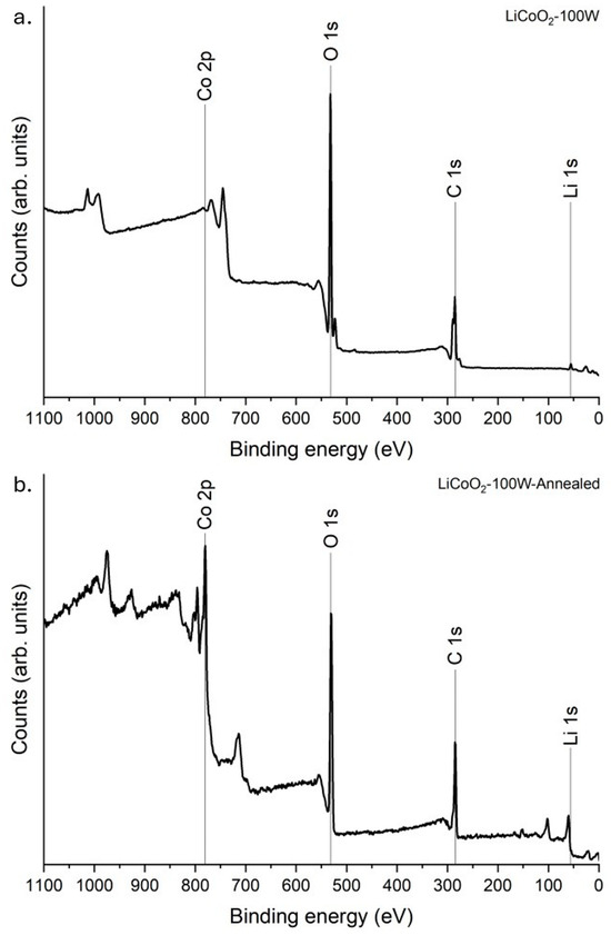 XPS survey spectra of LiCoO2 coating before (a) and after (b) annealing. The spectra were obtained without any etching process.