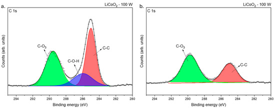 Based on the composition of the sample, XPS high-resolution spectra were taken in the following regions of interest (ROIs): Li 1s, C 1s, O 1s, and Co 2p. The binding energy peaks detected in the samples before and after etching are summarized in Table 1. Figure 6 shows the ROI spectra at the C 1s binding level before and after etching for the untreated LiCoO2 coating. Regardless of the heat treatment and the etching process, the C 1s spectra were similar in both samples. Two different peaks were detected at ~285.94 and ~289.83 eV, which corresponded with C−O−H and C−O3 bindings [29]. It is remarkable that after etching, the C−O−H bond disappeared and the C−O3 bond remained. This bonding could indicate the easiness of LiCoO2 to react with C and H after being exposed for a short time to ambient conditions [30,31]. Compared with other materials, it is common that the intensity of the C−C bond peak, used to adjust the XPS spectra, decreases after etching and the other carbon chemical bonds are not detected. However, it was not the case here; therefore, it implied that C actively reacted with LiCoO2. This point is discussed later.