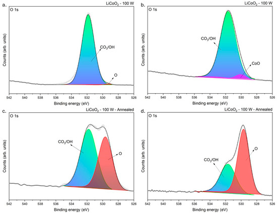 Figure 7 shows the O 1s spectra from LiCoO2 coatings before and after annealing. As established in Figure 6, C−O−H and C−O3 bonds were present in the coating. At the O 1s core level, a unique peak was detected at ~531.73 eV, consistent with the mentioned chemical bonds, and labelled CO3/OH [29,32,33]. Figure 7 reveals the persistent presence of this bond regardless of the sample state, suggesting that ambient air, which reacted with the coating, was likely the source of the carbonate ) and hydroxyl () compounds. Additionally, an O bond was detected at ~529.67 eV, consistent with inherent oxides in the coating. Even though this bond’s signal was weak in the untreated sample, it became more pronounced after annealing, indicating that annealing enhanced the oxidation of the coating. Up to this point, identifying the exact component (i.e., oxides or carbonates) formed in the coating had remained challenging due to the presence of Li and Co. However, after etching the untreated LiCoO2 coating, a slight peak at 530.26 eV, consistent with CoO, was detected (Figure 7b) [34].