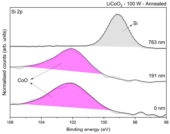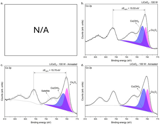 Figure 9 shows the Co 2p core-level spectrum obtained for the samples. Co was not detected in the as-deposited state, as illustrated in Figure 9a. This absence was likely due to lithium’s high reactivity, which promotes the formation of compounds such as LiOH and Li2CO3, pushing Li to diffuse toward the outermost layer and leaving Co concentrated in the inner region of the coating. The binding energy difference between the spin orbitals (ΔEspin) was approximately 15.6 eV, consistent with the values reported in the literature [29]. Regardless of the cleaning or treatment state, the coating exhibited two peaks at approximately 780.44 eV (labelled as CoxOy) and 781.88 eV. The first peak could represent a mixture of cobalt oxides, such as CoO, Co3O4, or Co2O3 [29]. However, according to Biesinger et al. [37], the overlapping binding energies of various cobalt oxides and hydroxides make the accurate quantification of these species difficult. The geometry of the Co 2p 3/2 spin level eliminated the possibility of metallic Co or Co3O4 being present [37]. The most likely explanation was a mixture of CoO, corresponding with the peak at ~780.44 eV, and Co(OH)2, associated with the peak at ~781.88 eV. In addition, the Co 3s core-level spectrum of the annealed sample showed a single consistent peak at ~102 eV, which corresponded with CoO species, as reported by McIntyre et al. [38] (see Figure 10).