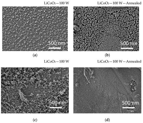 Figure 11 shows the SEM images of the LiCoO2 coating before and after annealing and cycling. The annealing process showed the formation of cracks on the surface of the LiCoO2 coating (Figure 11a,b). Indeed, higher annealing temperatures (above 550 °C) can enhance crystallinity but induce stress and structural changes that lead to cracking [18,39]. After 10 cycles, the untreated LiCoO2 coating showed the formation of a porous top layer (Figure 11c), indicating the interaction between the electrolyte and the coating, while the annealed LiCoO2 coating (Figure 11d) revealed a denser top layer covering the formed cracks. Tan et al. [40] reported that prolonged cycling significantly degrades the LiCoO2 surface, resulting in structural damage at the electrode–electrolyte interface. This indicated that the layered LiCoO2 structure exhibited low stability near its surface when more than 60% of the lithium was extracted.