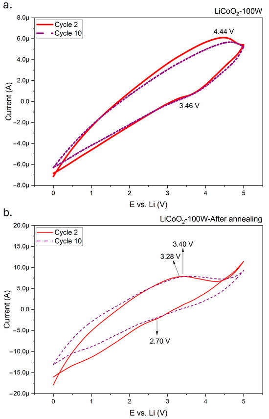 The unannealed sample exhibited a pair of broad, poorly defined anodic/cathodic peaks located at 4.44/3.46 V, indicating a single-step Li-ion insertion/deinsertion reaction and the associated redox process between Co3+ and Co4+ in the LixCoO2 phase [41,42]. The unusual peak shape and the significant potential difference between the anodic and cathodic peaks may have resulted from the scan rate used during the CV measurements. At higher scan rates, peak overlapping can occur due to the rapid movement of ions, increasing the current and leading to greater irreversibility in the redox process, as reflected by widened anodic and cathodic peak potentials [43]. After annealing, the cyclic voltammetry results showed a significant increase in the capacity of the LiCoO2 coating, as evidenced by a higher current range on the Y-axis of Figure 12. However, the redox process occurred at lower potentials, with peaks detected at 3.28/2.70 V. This suggested that annealing reduced the potential required for Li-ion insertion/extraction in the LiCoO2 coating. This behavior was likely influenced by the presence of additional crystallographic planes, as observed in the XRD results. Recrystallization following annealing likely enhanced Li-ion diffusion, reducing the potential needed for the reaction. Regardless of the coating’s state (annealed or unannealed), the potential required to trigger the redox reaction increased during the charging portion of the hysteresis curve in the CVs. Conversely, the potential required to trigger the reaction decreased during the discharging portion of the curve. These slight variations could be associated with the degradation of the coating’s electrochemical properties, a common phenomenon after repeated cycling [43].
