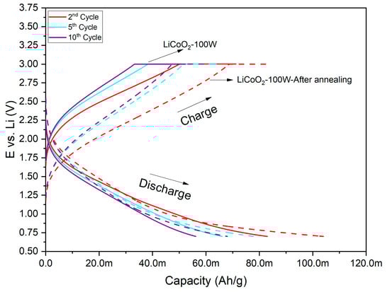 The charge/discharge plots illustrated the gradual degradation of the coating, as evidenced by the reduction in capacity with an increasing number of cycles (Figure 13). As discussed in the CV results, annealing the LiCoO2 coating significantly enhanced its capacity (see values on the X-axis), representing a notable improvement for practical applications. Comparing the discharge capacities at 0.7 V after 10 cycles, the annealed coating retained approximately 65% of its discharge capacity, while the unannealed sample retained about 68%. It is noteworthy that the discharge curves did not exhibit the typical potential drop, maintaining a specific capacity as expected. This behavior could be associated with the applied rate (0.85 C) during the measurements, suggesting partial lithiation/delithiation during the charge/discharge cycling. In terms of charge capacity retention, comparable values were observed after 10 cycles (~71% for the annealed coating and ~73% for the unannealed sample). This rapid degradation was expected under the tested conditions. The annealing process appeared to have had a minimal effect on capacity retention, consistent with Figure 13, which shows a larger specific capacity difference between the second and the tenth cycle in the annealed sample compared with the unannealed one. The first charge/discharge cycle was excluded from the measurements due to the inability to ensure identical initial charge conditions across samples.