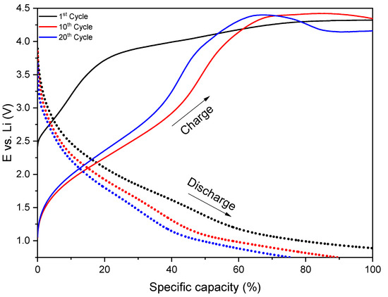An additional galvanostatic charge/discharge test was performed on the annealed sample, with the results displayed in Figure 14. As previously mentioned, the absence of a potential drop during the test indicated partial lithiation/delithiation in the coating. The higher applied potential during charging accelerated the degradation process, as expected. With an increase in the number of cycles, the charge curve underwent significant changes. After 10 cycles, a plateau became evident, which transformed into a broad peak after 20 cycles. This likely reflected the effects of coating degradation under this testing regime, significantly impacting discharge capacity retention, which decreased by approximately 13%. Another potential effect of the higher charging potential was the formation of oxygen-rich compounds, such as LiO3, or an increased concentration of Co3O4 in the coating, as suggested by the XPS spectra (Figure 9). These observations highlighted the complex degradation mechanisms occurring in the coating under elevated potentials.
