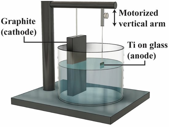 The titanium thin film employed in this study was prepared through electron beam evaporation. Using a high-purity titanium target, a 300 µm layer of titanium was deposited onto glass substrates, employing two different beam powers and the resulting deposition rates of 0.5 Å/s and 3 Å/s. These rates were selected to investigate their impact on grain size and the resulting nanotube morphology. Experiments were conducted on microscope glass slides (Thermo Fisher Scientific, Waltham, MA, USA) due to their insulating properties, which simulate the characteristics of zirconia dental implants. Standard cleaning protocols with acetone (Thermo Fisher Scientific, Waltham, MA, USA), IPA (Thermo Fisher Scientific, Waltham, MA, USA), and nitrogen (Airgas, Radnor, PA, USA) ensured surface consistency. Anodization was conducted in a 95 wt% ethylene glycol (Sigma-Aldrich, St. Louis, MO, USA) solution containing varying concentrations (0.5%, 1%, 2%, and 3%) of ammonium fluoride (NH4F) (Sigma-Aldrich, St. Louis, MO, USA), with distilled water constituting the remaining composition. Given the non-conductive nature of the glass substrate, a specially designed anodization device, illustrated in Figure 1, was utilized to ensure a consistent and uniform anodization process across the entire sample surface. The device featured a cylindrical electrochemical reactor chamber incorporating a graphite cathode and a vertically motorized anode connected to the as-deposited Ti-on-glass sample. Both electrodes were linked to a 30 to 90 V DC power supply (Keysight, Santa Rosa, CA, USA). The mobile anode was connected to a 3D printed connection shaft affixed to a high torque, low rpm motor powered by an additional power supply, where the vertical moving speed of the anode sample can be precisely controlled. This mechanism regulated the speed at which the sample was gradually immersed into the electrolyte.