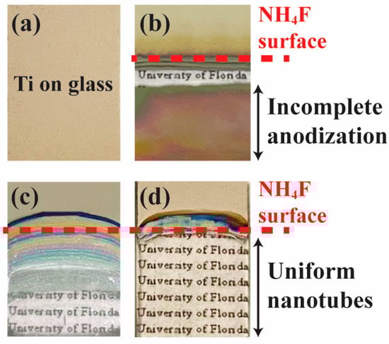 The effect of utilizing the customized anodization tool with controllable anode submerging speed on sample surface uniformity is shown in Figure 3. A sample consisting of Ti thin film deposited on a glass substrate, as depicted in Figure 3a, underwent the traditional anodization process with a fixed anode, fully submerged in the NH4F electrolyte before applying voltage. The resulting appearance in Figure 3b shows a band of transparent nanotube region formed at the surface of the electrolyte due to the higher current density closer to the wire connection. This disrupted the continuity of the conductive Ti layer, preventing further anodization and leaving the rest of the sample with incomplete nanotube growth. To address this issue, the anode placement was changed from a fixed position to one that moves vertically at a controllable speed, allowing anodization to progress from the edge of the sample upward as local nanotubes grow to their full length. A sample anodized with this new mechanism using the customized tool is shown in Figure 3c. The dashed line indicates the final surface level of the electrolyte at the end of the anodization process, where the speed of the moving arm exceeded the anodization rate. This mismatch resulted in shallower nanotube depths near the air–electrolyte interface due to insufficient submerging time. Finally, Figure 3d demonstrates the optimized result, where the speed of the sample submerging aligned precisely with the anodization rate. This produced a uniform nanotube array surface morphology, as evidenced by the transparent and consistent appearance across the entire region under the electrolyte. The success of the fully anodized nanotube surface with excellent uniformity highlights the effectiveness of the improved progressive anodization mechanism.
