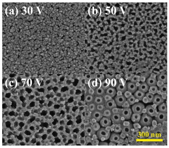 Surface morphology of anodized TiO2 nanotubes with NH4F concentration of 0.5% and voltage of (a) 30 V, (b) 50 V, (c) 70 V, and (d) 90 V.