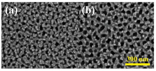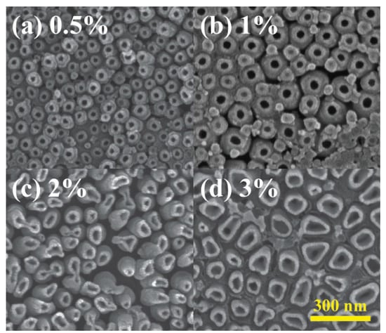 The influence of NH4F electrolyte concentrations on nanotube array surface morphology was also explored in Figure 6. Four concentrations, 0.5, 1, 2, and 3 wt% were investigated, each yielding nanotube inner diameters of 50, 80, 100, and 120 nm. Similarly to the effect of different voltages, nanotube size exhibited a positive correlation with NH4F concentrations, attributed to accelerated etching and dissolution of the TiO2 barrier layer. Higher electrolyte concentrations also lead to thinner side walls of the nanotubes since the etching part of the reactions dominated more. The same phenomenon could also be observed when the sample with anodized TiO2 nanotubes was soaked in 3% NH4F electrolyte again for 30 min without applying voltage. As shown in Figure 7, the size of the nanotubes increased 100% due to the continuing etching of the reactions coupled with the absence of electric-field-driven oxidation.