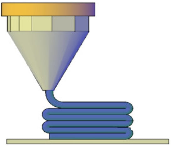 Schematic representation of a heated nozzle in an FFF/FDM 3D printer, depositing the molten thermoplastic material on a layer-by-layer modus operandi.