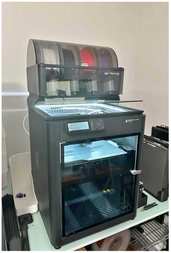 Bambu Labs (Shenzhen, China), for instance, has gained attention for its integration of multi-material and multi-color printing capabilities, coupled with high-speed performance, making it a versatile choice for professional and commercial use [22]. While a normal speed for the established desktop FFF/FDM category would be in the range of 50–70 mm/s, these 3D printers exhibited a maximum deposition speed of 600 mm/s, with an average speed of 300 mm/sec being sufficient to attribute even the most intricate design details. The company’s high-speed printers leverage an innovative system that combines advanced hardware with optimized slicing software, allowing for faster printing without compromising quality [23]. Similarly, Creality (Shenzhen, China), a well-established name in the 3D printing community, has introduced high-speed models like the K1 series, which offer improved print speeds, enhanced reliability, and ease of use [24]. These printers incorporate features such as upgraded extruders and faster stepper motors, along with improved hotends that allow for higher throughput. Prusa (Prague, Czech Republic), known for its precision and reliability, has also introduced high-speed printing options with the Prusa MK4 model, which boasts improved hardware and software optimizations to achieve faster print speeds without sacrificing the quality of finished prints [25,26]. These advancements in speed are accompanied by developments in enhanced cooling systems and print beds, as well as specialized hotends, allowing for smoother extrusion at higher speeds. Figure 2 depicts a Bambu Labs P1S enclosed 3D printer.