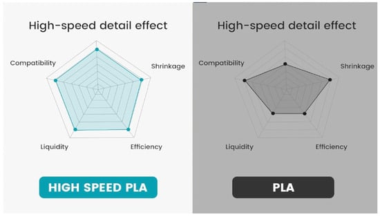 High-speed PLA is an evolution of the traditional PLA filament, designed to optimize performance when used with high-speed 3D printers. High-speed PLA has been engineered with modified polymer blends that offer faster curing times and enhanced layer adhesion, allowing for smoother prints at higher speeds [55]. This material often incorporates additives that improve its flowability and reduce cooling times, which are essential for high-speed printing processes. The improvements in high-speed PLA make it a viable option for rapid prototyping, where time to market is a critical factor. While it retains most of the benefits of traditional PLA, such as low environmental impact due to its biodegradability, it also addresses the need for faster production cycles in applications that do not require extreme heat resistance or mechanical strength [56]. High-speed PLA finds extensive use in industries where rapid prototyping, low-cost production, and detail precision are paramount, such as consumer goods, educational tools, and decorative items. Figure 3 depicts the differences in exhibited properties of regular and high-speed PLA when subjected to high printing speeds, as presented by the well-known 3D printing raw material manufacturer SUNLU [57].