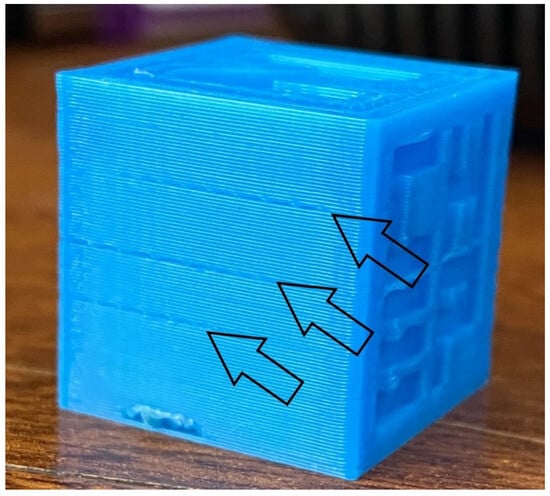One of the key metrics of material performance at high speeds is dimensional accuracy [82]. Traditional materials often suffer from dimensional distortions when printed rapidly due to the uneven cooling and thermal stresses introduced by faster printing. High-speed materials address this issue by incorporating stabilizers and additives that reduce thermal expansion and improve cooling behavior [83]. For instance, high-speed PLA and ABS exhibit a more uniform cooling process, reducing the risk of shrinkage and deformation. This enhanced thermal stability enables the production of parts with precise geometries and tight tolerances, even during high-speed printing [83,84]. Such improvements are particularly important in industries like aerospace and automotive, where exacting dimensional accuracy is critical for parts that need to fit within larger assemblies or perform under load. Figure 5 depicts the dimensional inaccuracies and surface finish flaws (indicated by the black arrows) on a 3D-printed item fabricated with conventional PLA raw material.