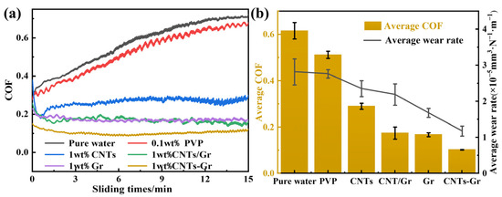 (a) The COF curves of pure water, PVP, CNTs, CNTs/Gr, Gr, and CNTs-Gr and (b) average COF and wear rate.