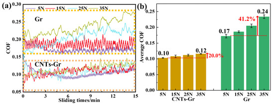 (a) The COF curves of Gr and CNTs-Gr under 5–35 N loads and (b) the average COF of Gr and CNTs-Gr under 5–35 N loads.