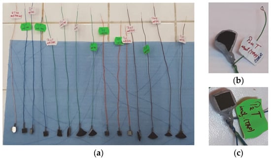 A standard corrosion cell composed of a saturated calomel electrode (SCE—reference electrode), a platinum electrode (counter electrode) and the working electrode, which consisted of the experimental samples to be investigated, was used for corrosion behavior experiments. Prior to the corrosion tests, the samples were prepared in order to ensure electrical contact followed by the isolation of the electrical contact and of the entire sample, leaving only the surface of interest to be exposed to the electrolyte. Thus, to ensure electrical contact, an insulated Cu wire was micro-welded on the surface opposite the thermal sprayed surfaces. The electrical contact and the entire sample (except the surface of interest) were then covered with silicone (Figure 2). Subsequently, using macroscopic images of each embedded sample and ImageJ software, the area of the non-silicone-coated surfaces was measured and then used for the calculation of the electrochemical parameters. The electrochemical cell was inserted into a Faraday cage to eliminate interference from electromagnetic fields during the corrosion tests.