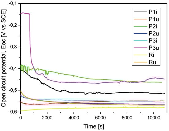 Open-circuit potential evolution (Eoc) for all the tested samples.