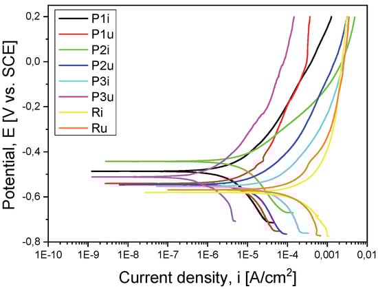 If we take into account the electrochemical measurements presented in Table 3, from the open-circuit potential (Eoc) evolution point of view, we observe that sample P2i has a more electropositive potential (−463 mV) and, consequently, a more noble electrochemical character and, possibly, a better corrosion behavior. The same sample (P2i) also recorded a more electropositive corrosion potential (Ecorr) (−442 mV), i.e., a better corrosion behavior in the equivalent solution compared to the other three samples.