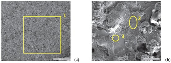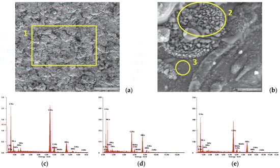 SE images of the P1i sample surface: (a) 200×; (b) 8000×. EDS spectra for (c) area 1, (d) area 2 and (e) area 3.
