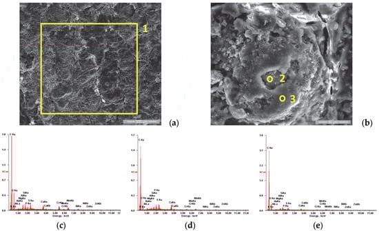 SE images of the P1u sample surface: (a) 200×; (b) 2000×. EDS spectra for (c) area 1, (d) point 2 and (e) point 3.
