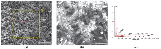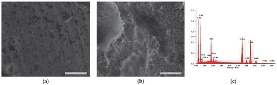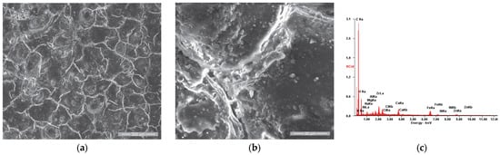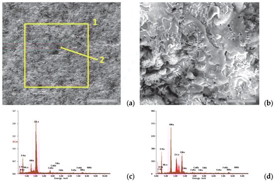 In order to supplement the results obtained from the corrosion tests, observations were made of the morphology of the sample surfaces using scanning electron microscopy. The analyses were performed using a Quanta 200 3D Dual-Beam electron microscope (FEI, Eindhoven, The Netherlands, 2008) equipped with the chemical analysis module produced by EDAX-Ametek. The Low-Vacuum mode and Large-Field Detector (LFD) were used, and the secondary electron (SE) images presented in Figure 5, Figure 6, Figure 7, Figure 8, Figure 9, Figure 10, Figure 11 and Figure 12 were acquired at magnification powers between 200× and 8000×.