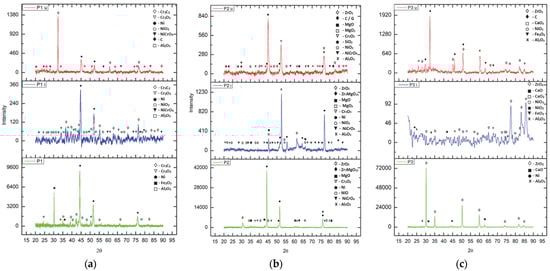 The third type of coating investigated is composed of the same type of BC—Al2O3-30 (Ni20Al)—with a TC of calcium-stabilized zirconium oxide (ZrO2-5CaO). On the surface of the as-coated (P3) sample, the presence of the specific phases of the powder used to obtain this TBC is observed: calcium (COD: 9006716) and zirconium oxides, aluminum oxide present in the BC layer and the nickel element. After exposure to the corrosive environment (P3i), additional oxidation of nickel is observed, with the formation of NiO2 and NiO3, but also of calcium, with the formation of calcium peroxide (CaO2, COD: 9006836), the major compound being zirconia, as expected. The presence of iron (II) oxide-FeO2 (COD: 9015157) is also noticed, a sign that the porosity of the coating allowed for the oxidation of the substrate. When analyzing the coating after its use in operation, it can be observed that the main phases are carbon (C16 monoclinic, COD: 9012233; C80 orthorhombic, COD: 9005088), forming the residue film generated after fuel combustion, zirconium oxide and calcium peroxide and oxide. Besides these, the presence of Ni oxides, aluminum oxide (corundum) and iron (II; III) oxide of the Fe3O4 type (COD: 9006248, as a result of exposure to high temperatures during engine operation) is also observed.