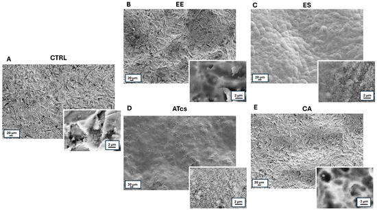 Low- and high-magnification (insets) SEM images of discs subject to different surface treatments. (A) CTRL disc; (B) EE disc; (C) ES disc. 3; (D) ATcs disc; (E) CA disc.