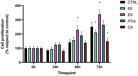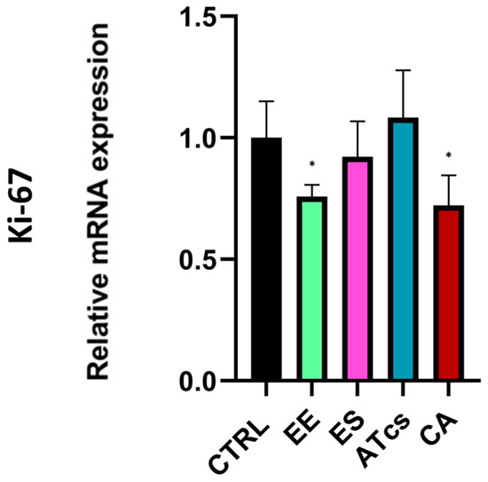 Ki-67 expression levels evaluated by Real-Time PCR at 72 h. Values are expressed as mean ± standard deviation; * p < 0.05.