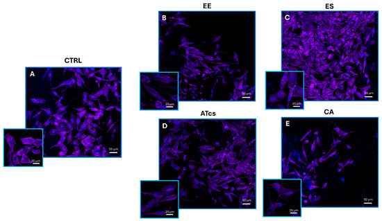 Representative confocal microscopy images of viable MG-63 cells cultured for 72 h on (A) control disc, (B) EE disc, (C) ES disc, (D) ATcs disc, and (E) CA disc. ProLong Glass Antifade Mountant with NucBlue was used for nuclei staining, while phalloidin was used to stain actin filaments. High-magnification pictures (20 µm scale bar) and inset with lower magnification pictures (50 µm scale bar).