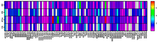 Heatmap of osteogenesis gene expression. Differential expression, at 72 h, of 84 genes involved in osteogenesis in MG-63 cells cultured on EE, ES, ATcs and CA discs compared to the control.