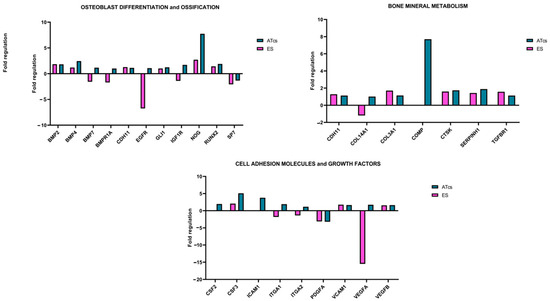 The differential expression of 84 genes involved in osteogenesis was analyzed via an RT-PCR array (Figure 5). Several genes were found to be dysregulated in MG-63 cells cultured on discs characterized by different surface treatments; this is compared to cells cultured on the CTRL disc. The fold change expression of the 84 genes is reported in Figure 3, while Table 1 lists the exact value of the fold change in expression. Each surface treatment was able to dysregulate a number of the osteogenic genes analyzed, suggesting that surface treatment could play a key role in influencing gene expression. A two-fold increase in gene expression, in comparison to the control disc, was detected for the EE disc regarding genes CHRD, COMP, GLI1, ICAM1, NOG, and VCAM1; for the ES disc regarding genes ACVR1, BGLAP, BMP3, CD36, CHRD, CSF3, FLT1, FN1, ITGB1, MMP2, NOG, SMAD3, and TWIST1; for the ATcs disc regarding genes ACVR1, BMP4, COMP, CSF3, FGF1, ICAM1, and NOG; and for the CA disc regarding genes ACVR1, BMP4, CSF1, FN1, IGF2, MMP2, and SMAD3. Interestingly, surface treatment differentially suppressed the expression of the following genes: BGLAP, BMP5, BMPR1B, CALCR, COL10A1, COL15A1, COL2A1, GDF10, IHH, MMP9, PHEX, SP7, TNF, and TNFSF11 for the EE disc; AHSG, BMP5, BMPR1B, COL10A1, COL15A1, COL2A1, COMP, CSF2, FGF1, GDF10, ICAM1, IGF2, MMP9, PHEX, TGFB2, TGFB3, and VDR for the ES disc; AHSG, BGLAP, MMP10, and TNFSF11 for the ATcs disc; and AHSG, BGLAP, BMP5, BMPR1B, CALCR, CHRD, COL10A1, COL15A1, COL2A1, DLX5, FLT1, GDF10, IHH, ITGAM, MMP10, MMP9, PDGFA, PHEX, SPP1, TGFB2, TGFB3, TNF, and TNFSF11 for the CA disc. Figure 6 shows the quantification of the relative expression levels of genes involved in osteoblast differentiation, ossification, and bone mineral metabolism, as well as growth factors and cell adhesion molecules, after 72 h of culturing MG-63 cells on ES and ATcs discs.