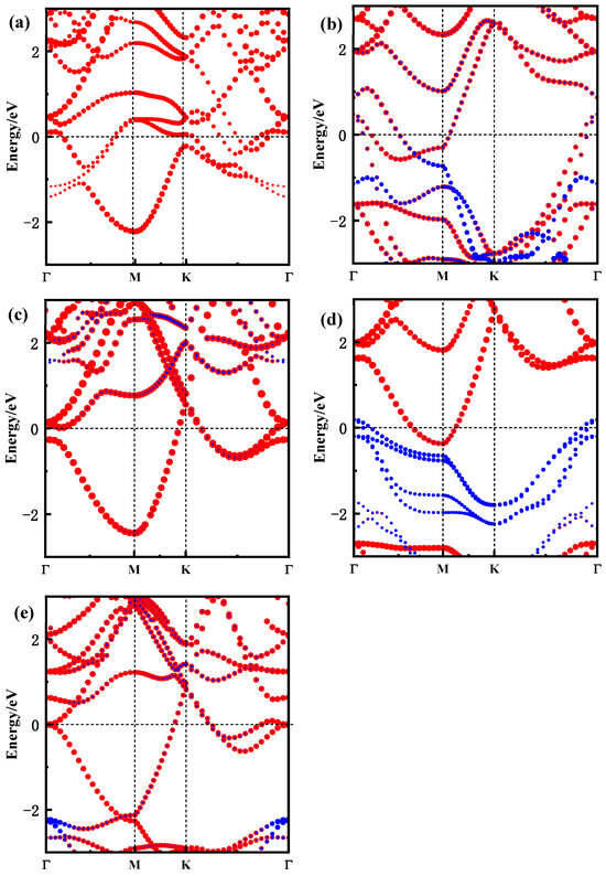Band structure of Zr3C2 and Zr3C2T2 along the high-symmetry path Γ(0 0 0)-M(0.5 0 0)-K(0.333 0.333 0)-Γ(0 0 0). (a) Zr3C2; (b) Zr3C2O2; (c) Zr3C2F2; (d) Zr3C2S2; and (e) Zr3C2Cl2. (The red and blue lines represent the energy band contributed by Zr3C2 and functional group T2, respectively).