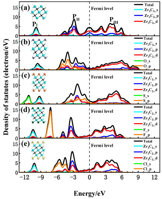 To discuss the interaction between the functional groups and Zr3C2, the total (DOS) and partial density of states (PDOS) for the bare Zr3C2 and functionalized Zr3C2T2 with the corresponding structural diagram are shown in Figure 4. In the DOS and PDOS of bare Zr3C2 in Figure 4a, a broader hybridization peak (0–6 eV) appears in the conduction band above the Fermi level due to the hybridization of Zr and C, indicating a strong Zr-C bond. There are two main peaks in the valence band, one contributed by the Zr3C2-p orbitals (−10 eV) and the other by the combined Zr3C2-p and Zr3C2-d orbitals (−3 eV). In addition, a large peak at the Fermi level may induce instabilities in bare Zr3C2, suggesting that Zr3C2 tends to be functionalized by terminal groups [61]. As can be seen in Figure 4b–e, different functional groups have different effects on the DOS of Zr3C2T2. The results show that when Zr3C2 was functionalized by O, F, S, and Cl, the DOS near the Fermi level was affected by the p orbital of the functional groups, while the s orbital of the functional groups only affected the valence band away from the Fermi level. In the PDOS of Zr3C2O2 and Zr3C2S2, as shown in Figure 4b,c, it is the hybridization between the p orbitals of the functional groups (O-p and S-p) and the Zr3C2-d orbitals that enhances the extensibility of the hybridization peak originally located at −3 eV and made the DOS near the Fermi level move towards the conduction band. This phenomenon observed in Figure 4b,c aligns with the band structures of Zr3C2O2 and Zr3C2S2, which exhibit a distinct tendency to shift toward the conduction band. In addition, the broader hybridization peaks in the conduction band are also affected by the oxygen and sulfur functional groups. Because of the effect of the functional groups, the contribution of the Zr3C2-p orbitals to the wide peaks is reduced and shows stronger localization at −2 eV~0 eV. However, it can be seen in Figure 4d,e that when the Zr3C2 MXene was functionalized by F and Cl, the hybrid peak between the functional groups and Zr3C2 was not found.
