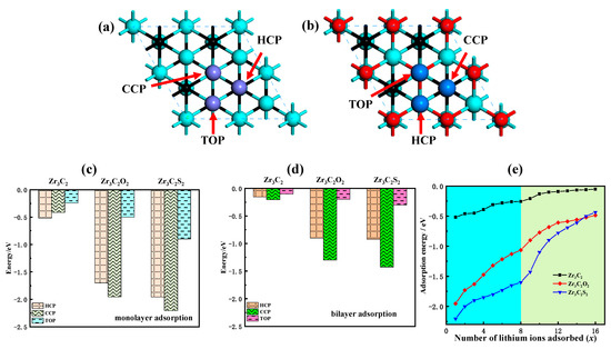 Lithium storage properties of bare Zr3C2 and Zr3C2T2. (a,b) The potential adsorption sites of lithium ions on bare Zr3C2 and Zr3C2T2 surfaces, respectively; (c,d) The monolayer and bilayer adsorption energies of lithium ions at HCP, CCP, and TOP sites, respectively; (e) The relationship between the number of adsorbed lithium ions (x) and the adsorption energy.