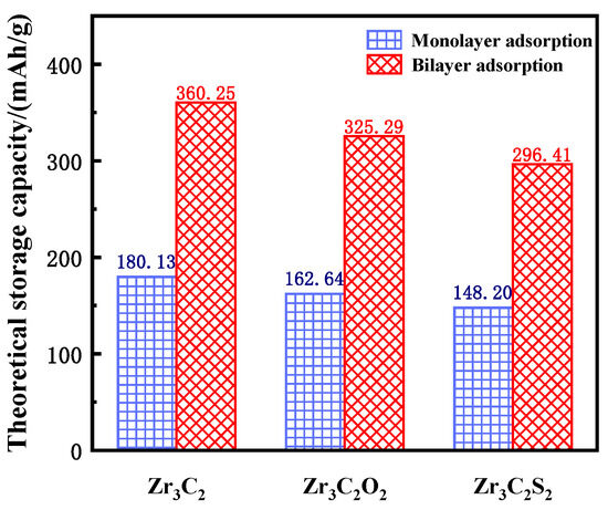 where z represents the valence number (z = 1 for Li), F is the Faraday constant (26.810 Ah/mol), and W is the atomic mass (297.68 g/mol for Zr3C2, 329.68 g/mol for Zr3C2O2, and 361.80 g/mol for Zr3C2S2). In Equation (3), 4W is used because a 2 × 2 × 1 supercell was constructed to investigate the lithium storage properties. The theoretical lithium storage capacity of single-layer adsorption and double-layer adsorption was calculated separately, and the results are shown in Figure 7. The sky blue squares represent the theoretical capacity of monolayer adsorption, and the red oblique squares represent the theoretical capacity of bilayer adsorption. The theoretical lithium storage capacities of bare Zr3C2, Zr3C2O2, and Zr3C2S2 are 180.13 mAh/g, 162.64 mAh/g, and 148.20 mAh/g for monolayer adsorption and 360.25 mAh/g, 325.29 mAh/g, and 296.41 mAh/g for bilayer adsorption, respectively. Although the theoretical capacity of the bare Zr3C2 is higher than that of the functionalized Zr3C2T2 (Zr3C2O2 and Zr3C2S2), the application of the functionalized Zr3C2T2 in lithium storage is more promising because it is difficult for the bare Zr3C2 to continue the three-layer adsorption, while Zr3C2O2 and Zr3C2S2 can continue adsorption.