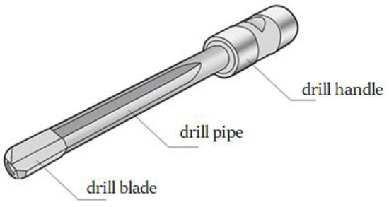 where and represent the displacement of the cross-sectional centroid along the and axes, respectively. denotes the angular velocity of the drill rod rotation, and E and represent the Elastic Modulus and density of the drill rod material, respectively. Comparing Equations (3) and (4), it is evident that and characterize the effects of Coriolis acceleration, while and represent the rotational inertia forces.