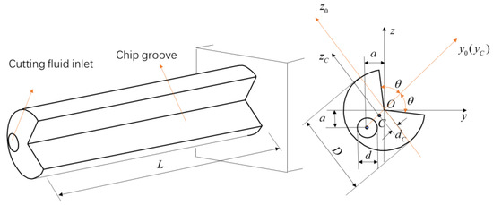 The structure of the gun drill, as shown in Figure 1, consists of three main components: the drill blade, drill pipe, and drill handle. The drill handle serves as the connection point with machine tools, while the drill blade performs cutting operations. This study focuses on the analysis of the drill pipe section, disregarding the structural characteristics of the drill blade. For dynamic analysis, the drill pipe is simplified as an isotropic cantilever beam with a circumferentially asymmetric cross-section, as shown in Figure 2.