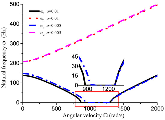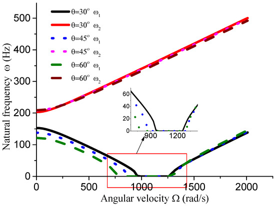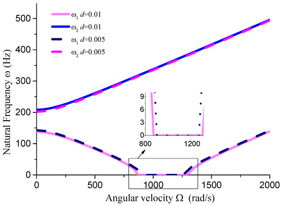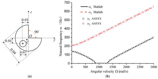 As shown in Figure 3b, the natural frequencies in the dynamic coordinate system can be distinctly categorized into two types with increasing rotational speed: forward and backward motions. When the backward motion frequency approaches zero, the system becomes unstable. Due to the circumferential asymmetry of the rotor structure, the backward motion frequencies can reach zero or negative values within specific speed ranges (negative values are represented as zero in the plot). Figure 3 also compares the theoretical analysis results from this study with ANSYS (version ANSYS 19.0) simulation results, demonstrating a high degree of consistency between the two, thereby validating the reliability of the findings presented in this study. The ANSYS analysis model and the command stream for solving the natural frequencies considering the effects of rotation are provided in Appendix B.