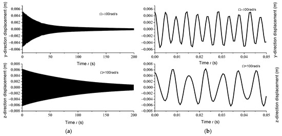 (a) Displacement responses in y and z directions at 100 rad/s within 200 s; (b) displacement responses in y and z directions at 100 rad/s within 0.05 s.
