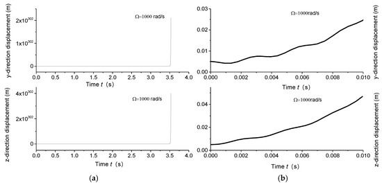 (a) Displacement responses in y and z directions at 1000 rad/s within 4 s; (b) displacement responses in y and z directions at 1000 rad/s within 0.01 s.