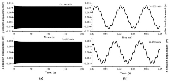 (a) Displacement responses in y and z directions at 1500 rad/s within 200 s; (b) displacement responses in y and z directions at 1500 rad/s within 0.05 s.