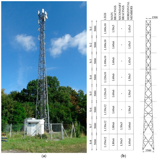 The analyzed structure: (a) view of the tower; (b) a schematic of the structure.