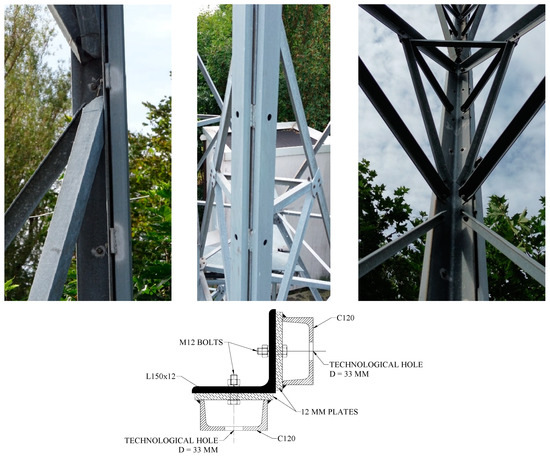 Tower legs have been reinforced in a manner that is encountered somewhat less frequently than shortening the buckling length of the strengthened element. This is achieved by expanding the cross-section, a method that is admittedly more labor-intensive and more difficult from the point of view of workmanship. However, this method allows for an increase in the buckling capacity and compression resistance of the section of the strengthened element. The strengthening of the section of the analyzed structure’s tower legs in segments S-3 to S-8 was implemented by mounting two additional branches made of channel sections to the flanges of the existing L-sections (Figure 2), using the sections shown in Table 1. The strengthening branches within a single L-section differ in the location of the joints along the length of the element. There is also a difference in the cross-sections used of the reinforcing elements in the two lower segments along the short sections. The connections of the reinforcing channels to the existing L-sections were made as bolted, using plates welded to the tops of the channel flanges. This solution involved drilling technological holes in the channel sections to allow for the reinforcement to be installed.